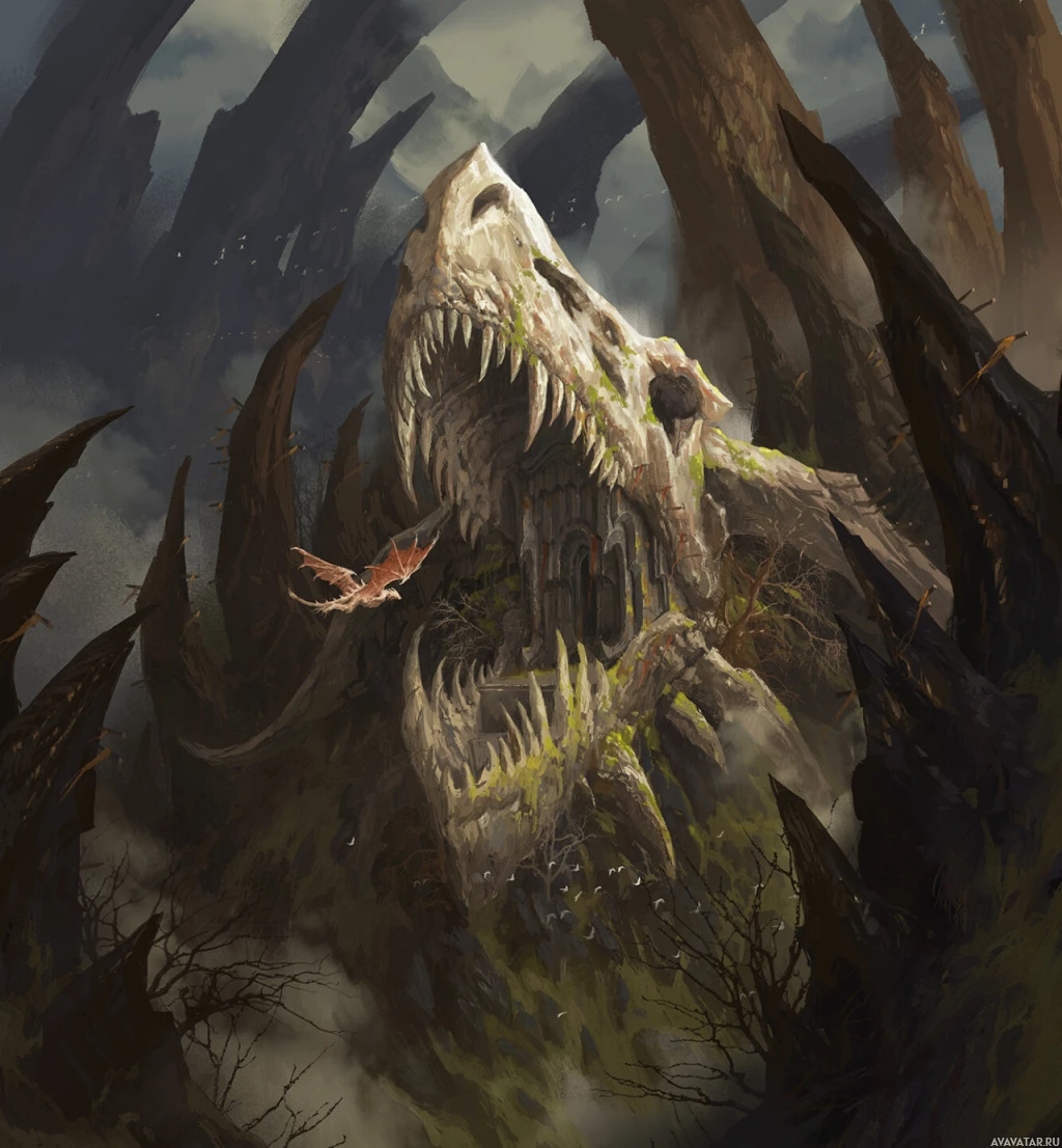 a fantastical scene featuring an imposing creature that appears to be a dragon or some other mythical monster. It has