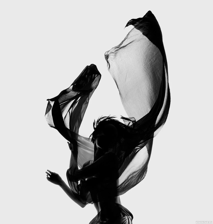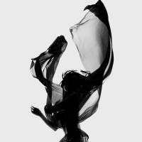 dark hair, who appears to be in motion. Her body is angled and her arms are raised above her head, which creates a dynamic and somewhat ethereal effect. She is wearing what seems to be flowing, semi-transparent garments that could be interpreted as sheer fabrics or veils being blown by the wind or the movement of her dance. The image has an artistic quality due to