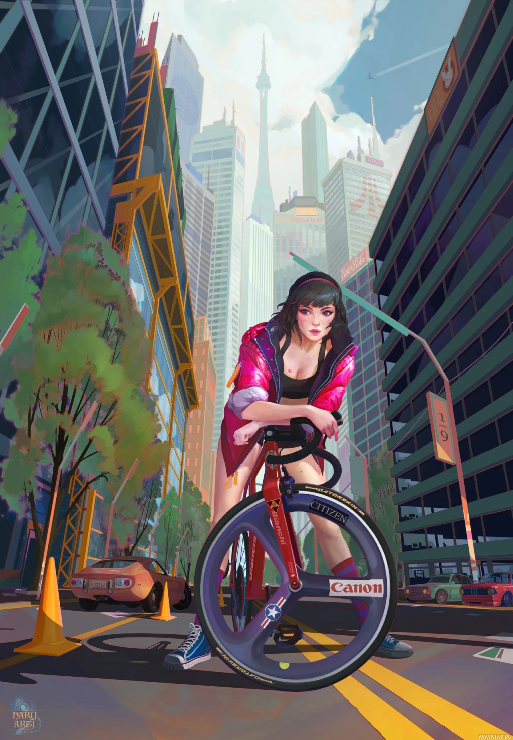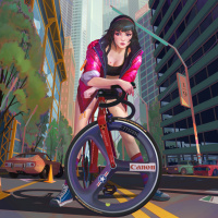 The image depicts a stylized illustration of a girl riding a bicycle. She is seated on the bike, which is stationary as it appears to be part of
