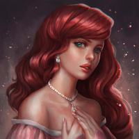 red hair and is wearing what appears to be a princess dress, complete with a pearl necklace. The background is dark and somewhat moody, enhancing