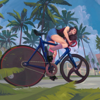 The image features a brunette woman on a bicycle. She is riding in the foreground of what appears to be a tropical location, with palm trees and a clear blue sky suggesting it might be a warm climate like Miami or another coastal city. The artwork has a vibrant, colorful feel to it, which adds to the overall cheerful atmosphere of the scene.