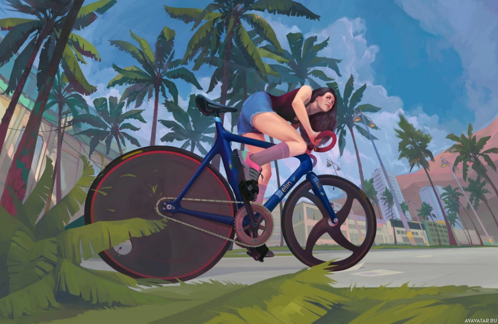 На снимке изображена брюнетка на велосипеде. Она едет на переднем плане того, что кажется тропическим местом, с пальмами и ясным голубым небом, предполагая, что это может быть теплый климат, такой как Майами или другой прибрежный город. Произведение имеет яркое, красочное ощущение, которое добавляет к общей веселой атмосфере сцены.