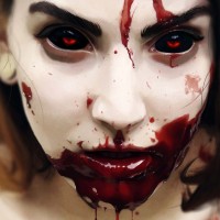 eye makeup and red accents around the eyes and mouth that give them a demonic appearance. There is also what appears to be blood splattered on their face, neck, and chest area, adding to the gruesome