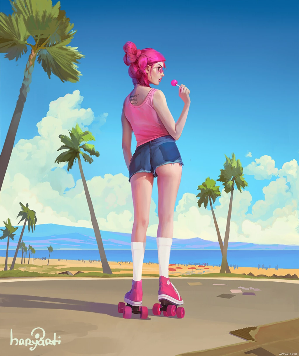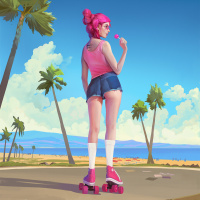 pink hair. She is riding a skateboard and has her back to the viewer. She's wearing a pink
