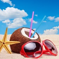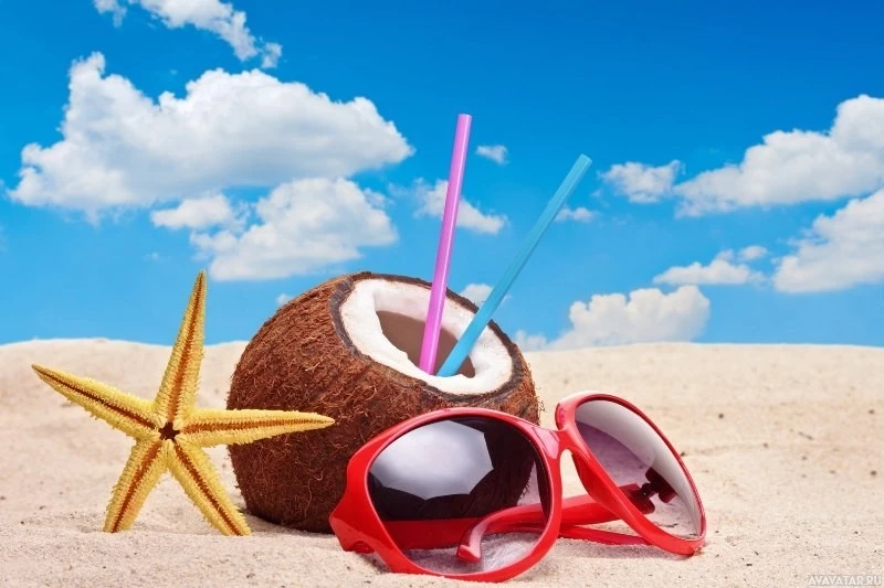 beach scene. There is a coconut on the sand, which has been cracked open to reveal its interior. Next to it are two pairs of sunglasses—red and white—and