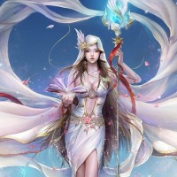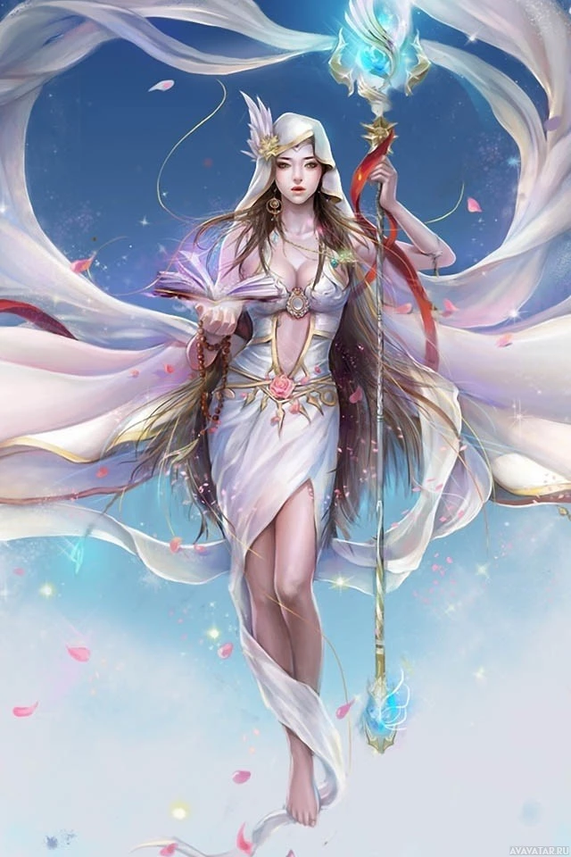 a female character. The girl is adorned with various elements that suggest a mystical or divine persona, such as wings and what appears to be a halo around her head. She holds a staff in one hand and what could be interpreted as an artifact or