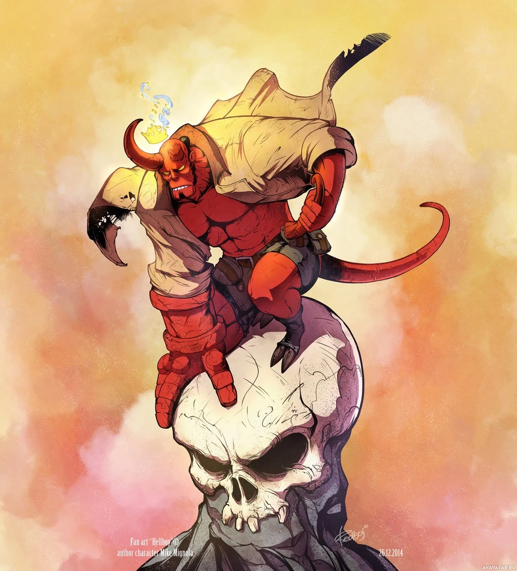 an illustrated character that resembles Hellboy, a fictional comic book superhero. He is standing on the shoulders of a skull, which could be a nod to