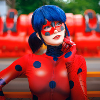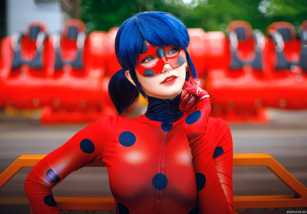 The image shows a person dressed in cosplay as Ladybug from the animated