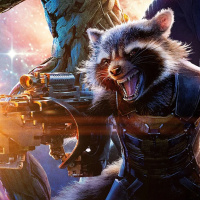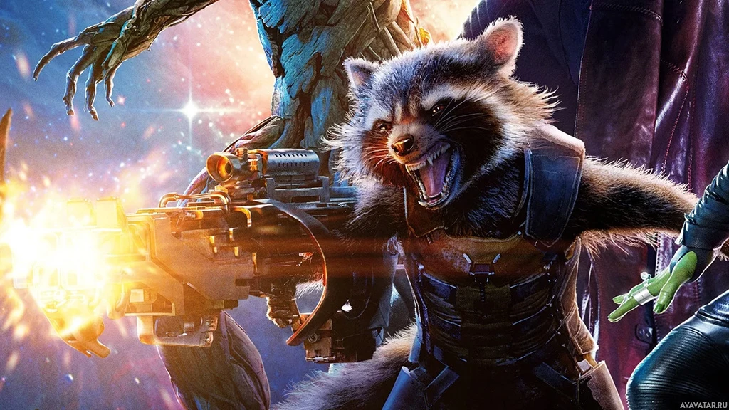 a group of characters from the Marvel Cinematic Universe. There is a raccoon-like creature on the left, known as