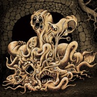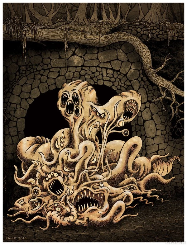a monstrous creature that seems to combine elements of various animals, such as tentacles like an octopus, a maw similar to that of a shark, and possibly other features that are hard to distinguish due to the complexity of the design. The creature is depicted in