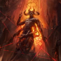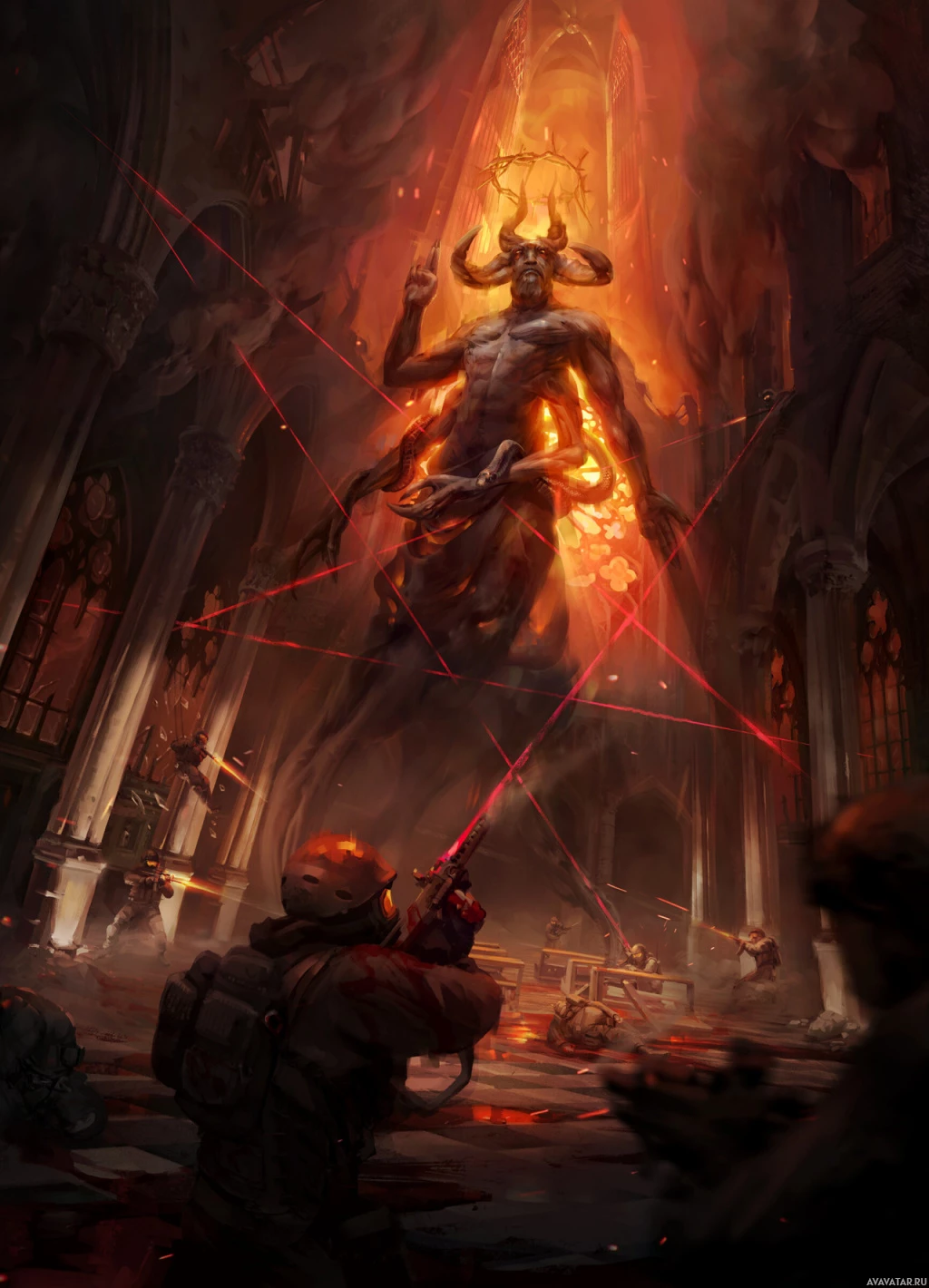 a fantasy scene with a demonic figure at the center. This figure is surrounded by