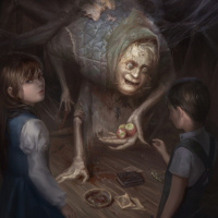 the spooky atmosphere. The child's expression seems calm, while the woman's face is twisted into a grinning smile that might suggest she is enjoying their company or is in a state of mild distress. The overall tone of the image is quite dark and moody, with a sense of unease. It does not depict anything explicitly violent or harmful; instead, it creates an atmosphere of suspense through its detailed artwork and character expressions.