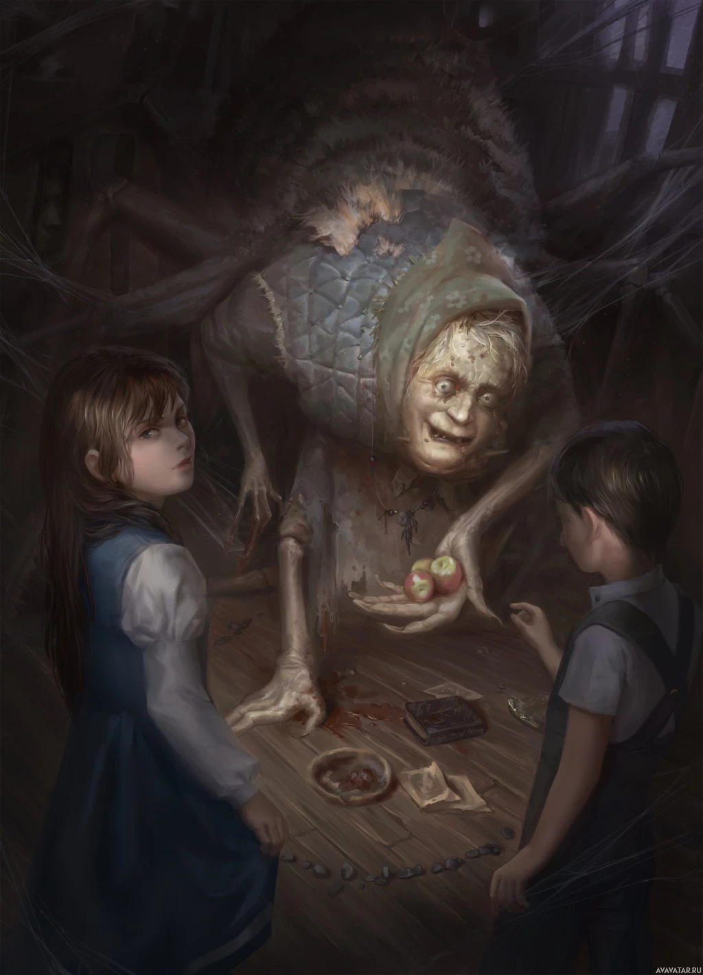 a young girl standing to the left side of the frame, looking towards an older woman who appears to be some sort of witch or magical creature. The woman has a grotesque face with