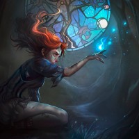 a magical entity, as suggested by the blue glow and sparkles emanating from her hand. Behind her stands a large stained glass window with