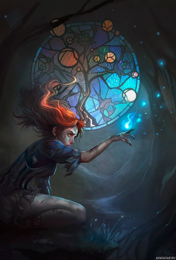 The image depicts a fantasy-themed illustration of a red-haired girl in