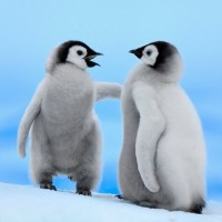 a cold environment. One penguin has its arms outstretched towards the other and is touching the chest of the second penguin with one flipper. They both seem to be looking at each other, suggesting some form of interaction or communication between them. The scene suggests a moment of social behavior or bonding within their