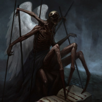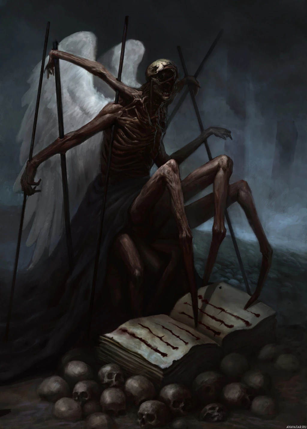 an angelic figure within this macabre context. The creature holds a scroll or book in one hand and what appears to be a weapon or staff in the other, adding to