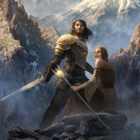 medieval armor and carrying a sword; he appears to be in a heroic or adventurous pose. To his right is a woman who looks at him with concern or empathy. Both characters are set against a backdrop of rugged mountains under