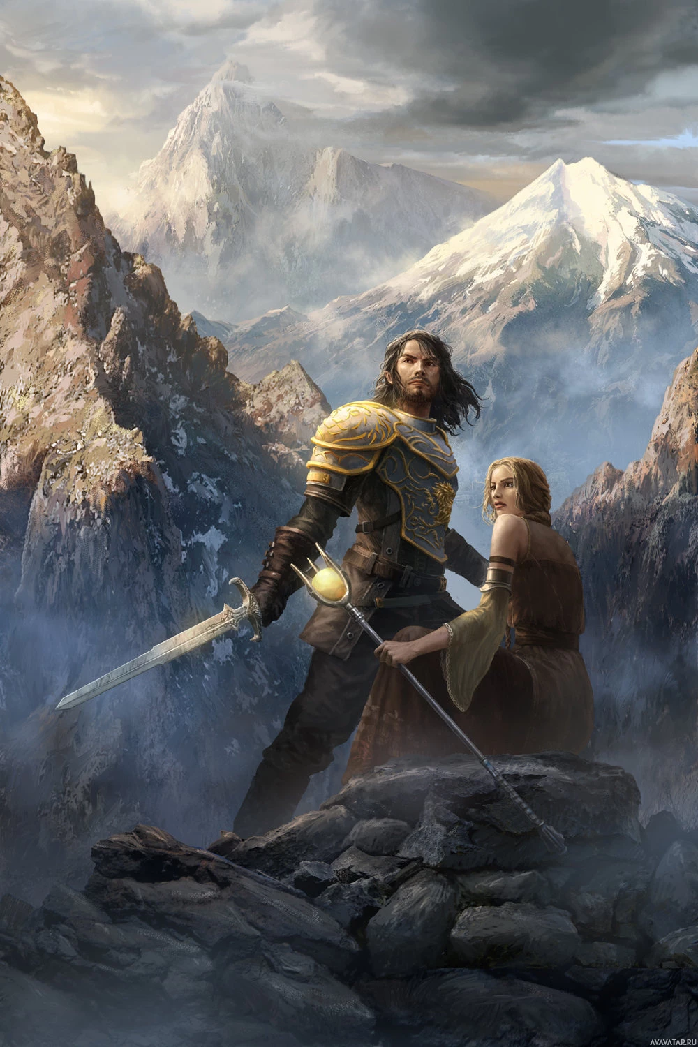 a fantasy scene with two main characters. On the left, there is a man wearing