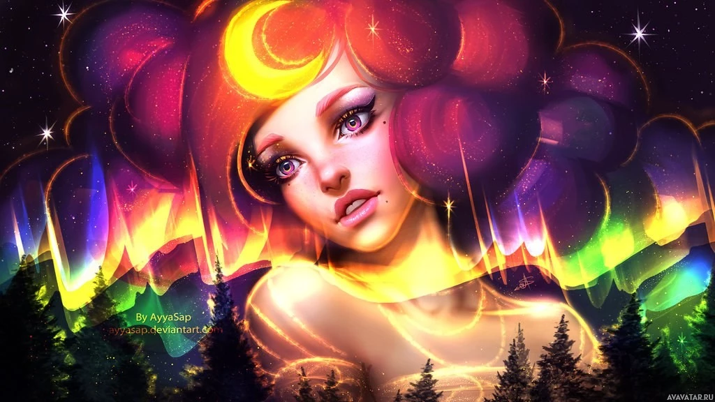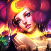 The image features a character who appears to be a combination of a human-like figure with some fantastical elements. She has an ethereal or otherworldly appearance, with glowing eyes and what looks like a halo around her head. Her hair is styled in a way that resembles flames, contributing to the mystical theme. The background depicts a serene landscape under a colorful sky filled with stars, which adds to