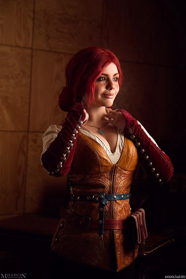 the video game "The Witcher 3: Wild Hunt." The individual is wearing a costume that includes a medieval-style dress with a low neckline and lace details, along with accessories such as