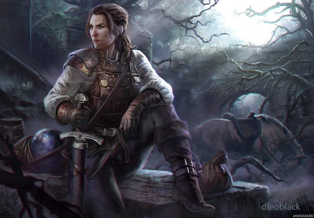 an ancient forest or battlefield with fog, adding to the mystical and mysterious atmosphere of the scene.