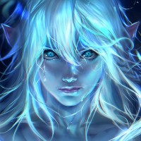 white hair, and blue eyes, which are common characteristics in fantasy artwork. The background suggests a dark, possibly