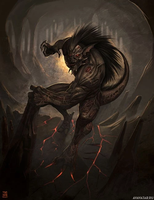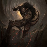 sharp teeth, and claws, and it appears to be in a menacing pose with its arms raised as if ready for battle or a fight. The background suggests a cave or underground setting with