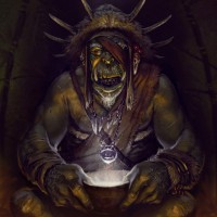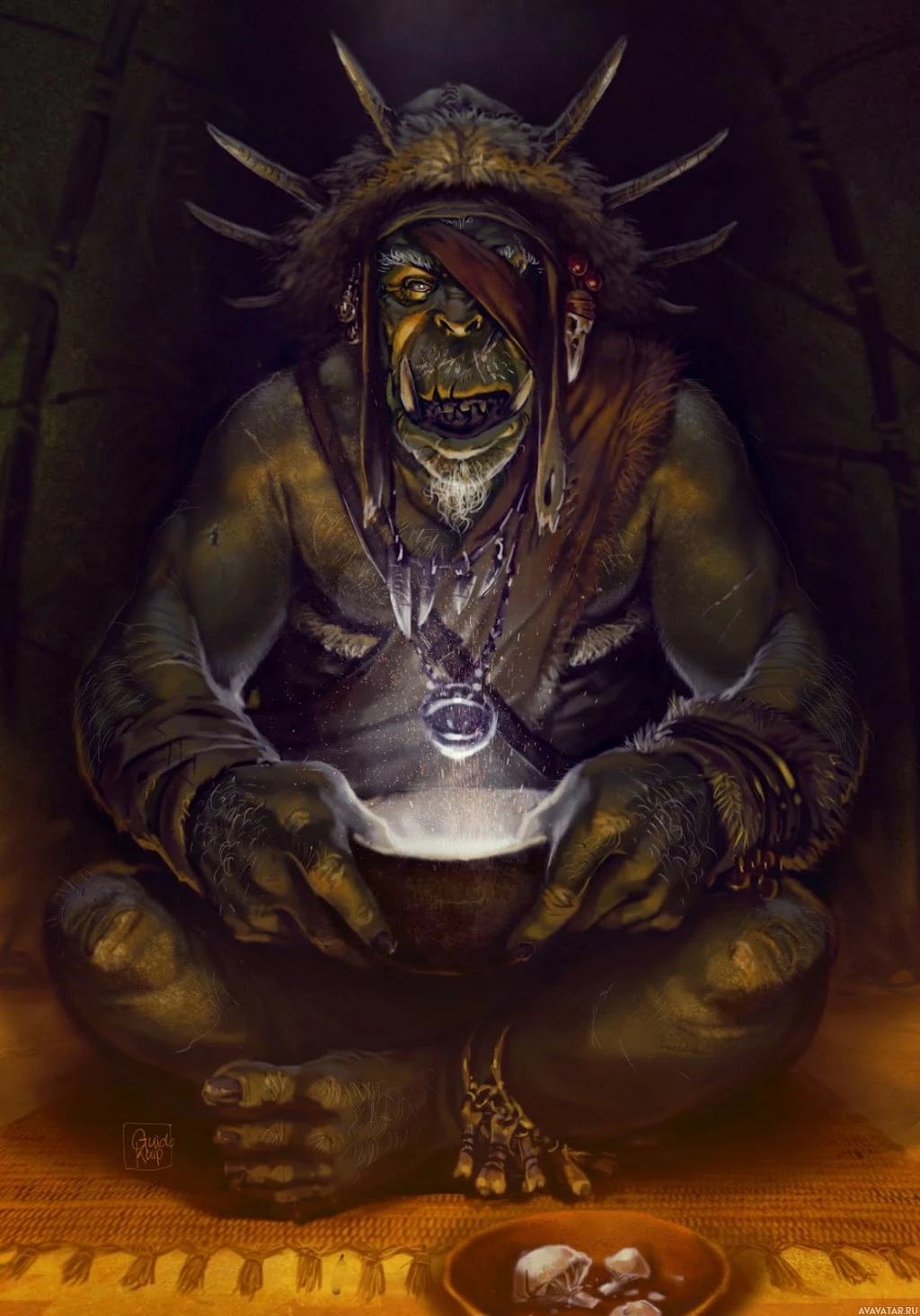 a fantasy orc character sitting cross-legged, seemingly engaged in some form of ritual or magical practice. The orc has a somewhat