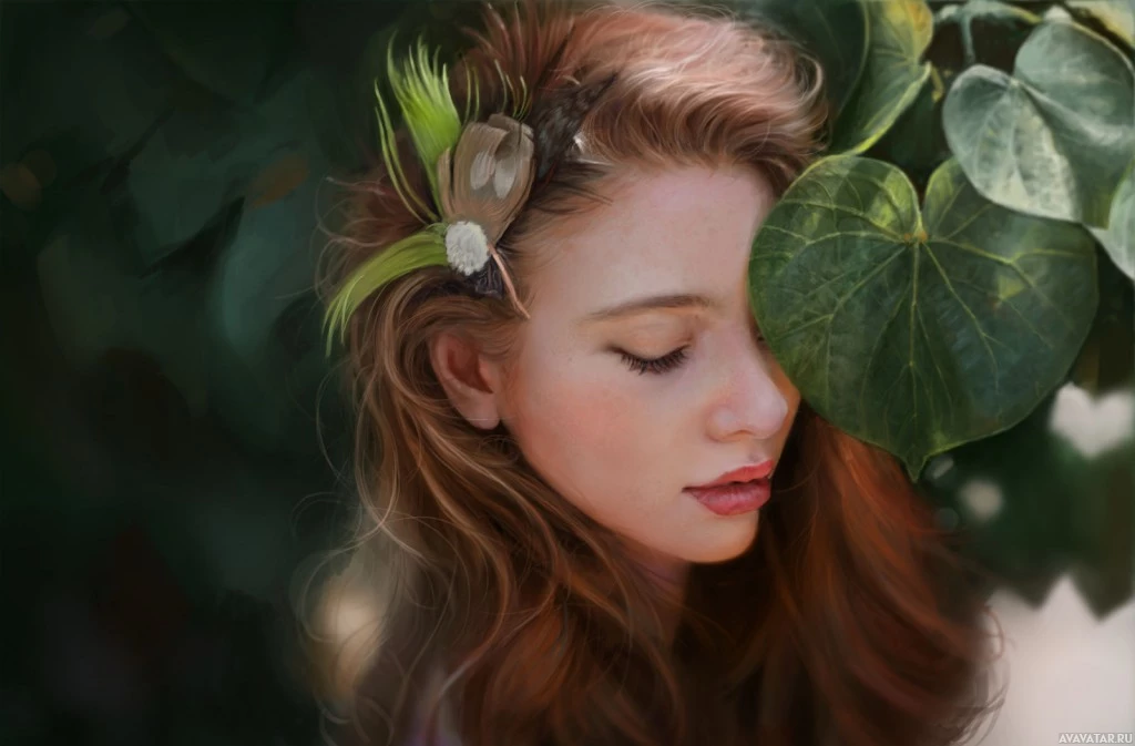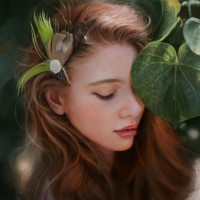 a feather accessory in her hair and is positioned near some leaves or plants, which she seems to be interacting with by either smelling them or placing her hand near them. The overall mood of the picture is serene and somewhat ethereal.