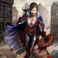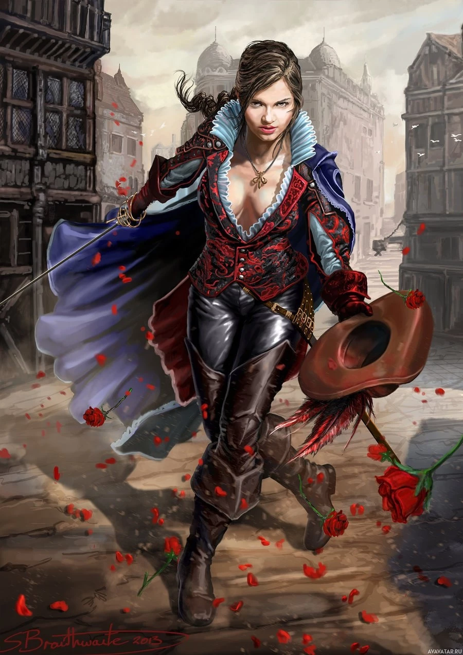 a female character dressed in a costume that resembles historical or fantasy attire, reminiscent of characters from stories like those of the Three Musketeers. She is holding what appears to be a hat in one hand and a sword in the other, suggesting she might be a figure of action or adventure. Her outfit includes a corset, breeches, boots, and a wide-