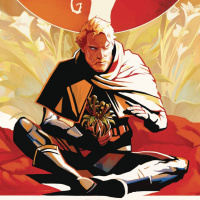 an illustrated character sitting cross-legged on the ground with a backdrop that has a circular motif in the center. The character appears to be a man dressed in a robe or cloak, which is draped over him and around his shoulders. His posture suggests he might be meditating or engaged in some form of contemplative activity. The art style leans towards fantasy elements, and the color palette consists of