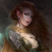 an elf warrior. The artwork has a dark and moody atmosphere, with a muted color palette that emphasizes the character's