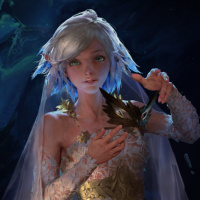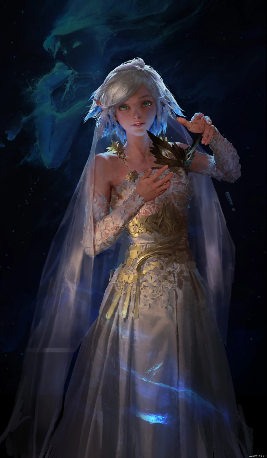 white hair and appears to be an elf given her pointed ears. The character is wearing a dress with intricate detailing on the bodice and sleeves, along with what looks like magical or mystical elements around her neck and shoulders. Her expression seems contemplative or poised, as if she's in the midst of casting a spell or performing some enchantment. The background is a blend of