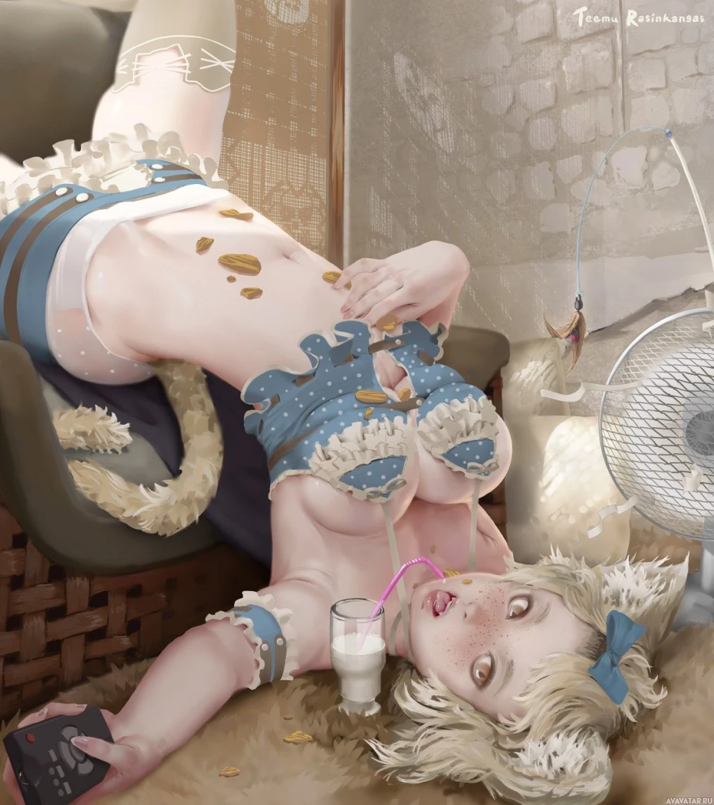 blonde hair, lying on her stomach, and wearing what seems to be a costume with cat ears. She is also holding