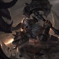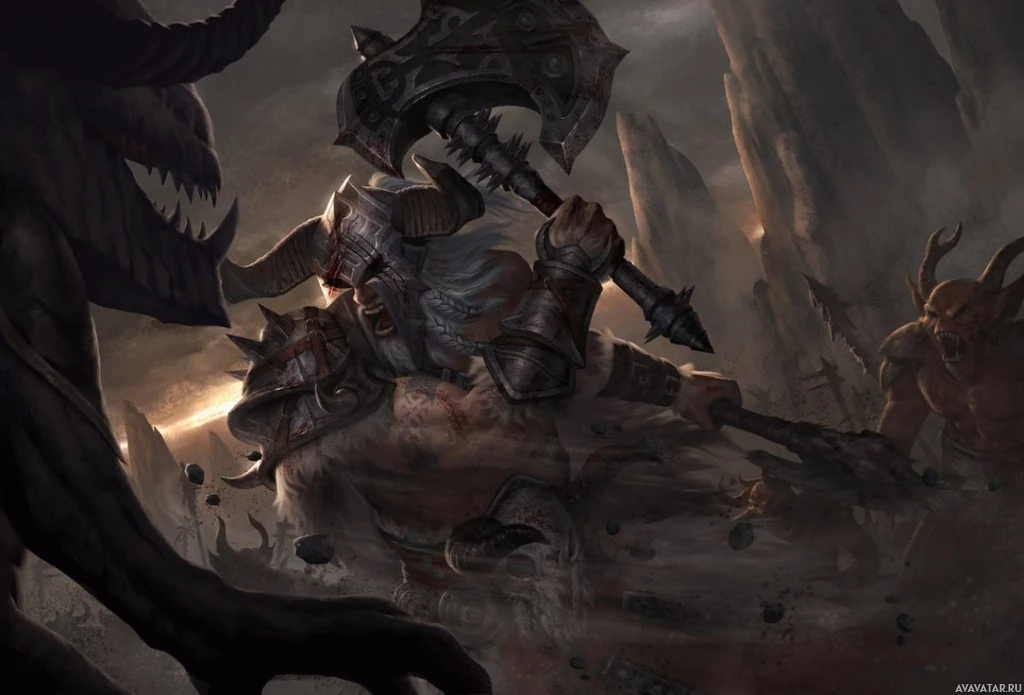 the video game "Diablo III." This character is a barbarian, as indicated by the axe in his hand and the armor he's wearing. He appears to be in the middle of