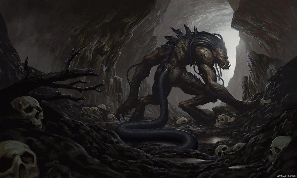 a cave setting. This creature has the distinctive features associated with depictions of demons or