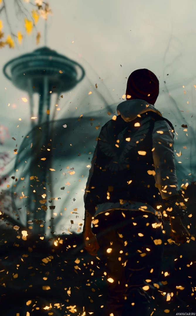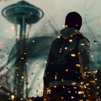a video game character standing in front of a cityscape with a prominent skyscraper, which is the Space Needle from Seattle. There are explosions and sparks around him, indicating an action-packed or intense moment within the game. The character appears to be male and dressed in an outfit that could suggest he might be a part of some sort of