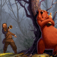 The image shows a scene where two characters are standing in a forest. One character appears to be a human man dressed in a brown tunic and carrying a horn, while the other is an anthropomorphic bear standing upright on its