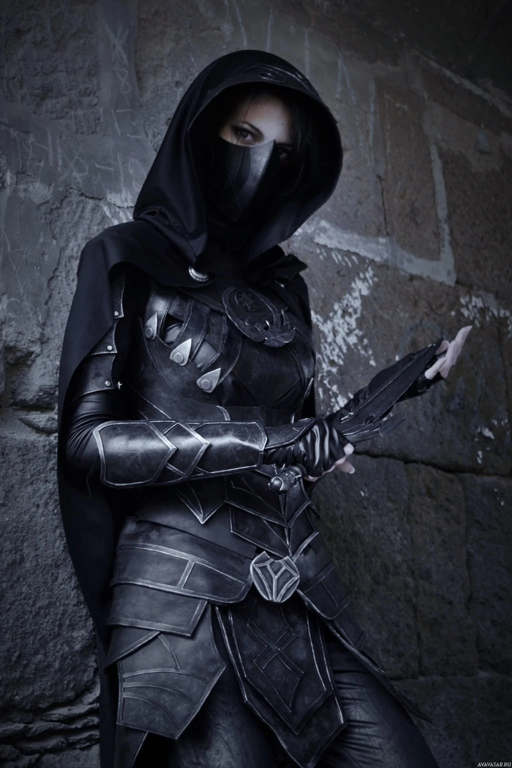 armor pieces and what appears to be a badge or emblem on one arm. This style of dress is commonly associated with cosplaying, where people dress up as characters from movies, TV shows, books,