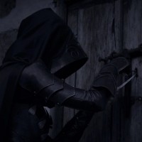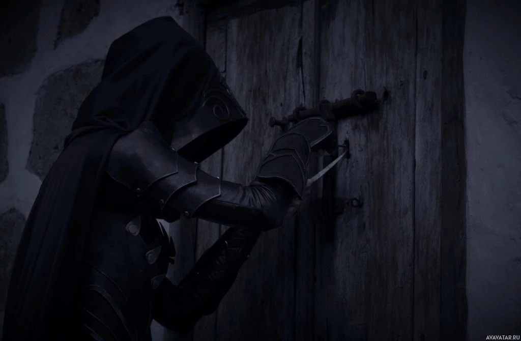 dark clothing with hood and hands adorned with gauntlets or gloves that seem to have an ornate design, possibly indicative of a particular role within the fictional universe, such as a warrior, assassin, or mage. The setting appears to be indoors, perhaps a room from the game itself, given the style and texture of the door and walls. The focus is on the character's face and hands, highlighting their expression and the details of their costume.