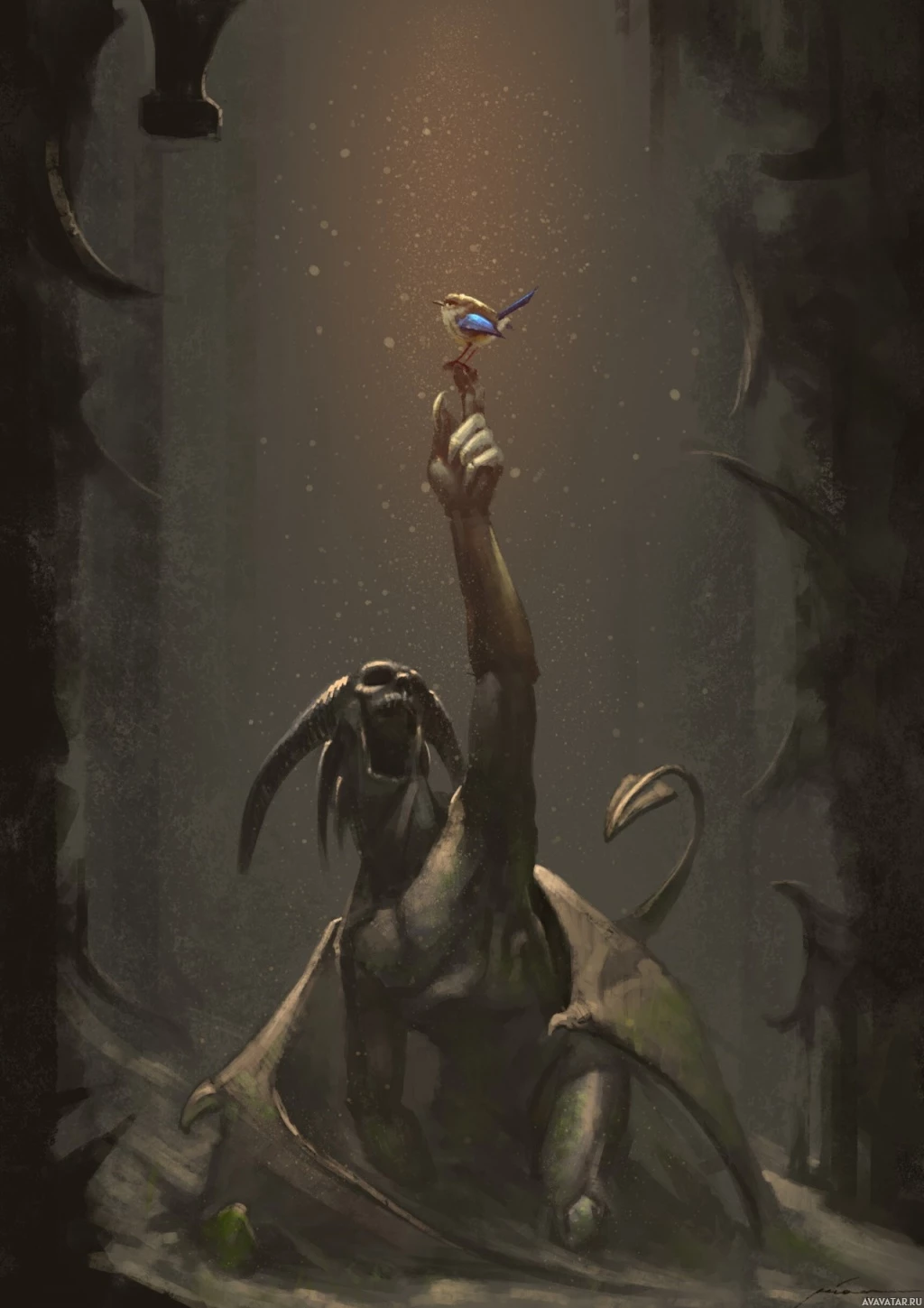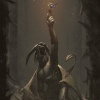The image features a fantasy-themed illustration with a central figure that appears to be a gargoyle. This creature is typically depicted as a guardian or protector, often associated with