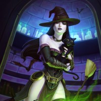 The image depicts a fantasy-themed character who appears to be a witch. She is wearing a black corset and has
