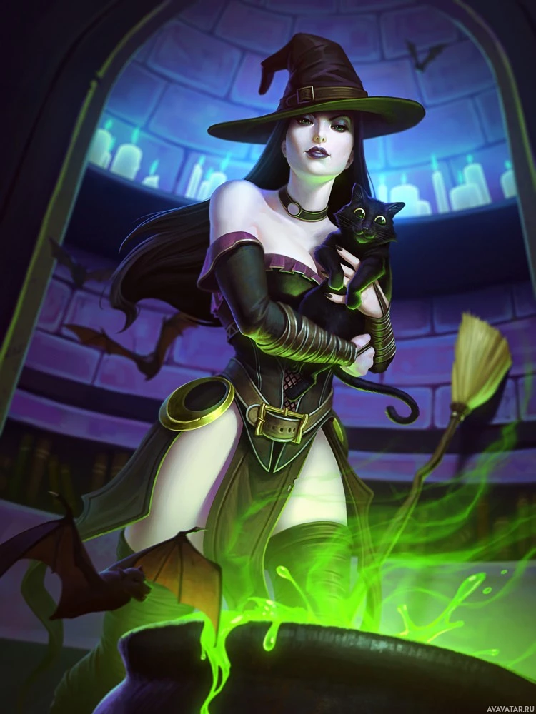 dark hair styled with pointed ears, suggesting an elven or magical nature. In her hands, she holds a cat that looks quite comfortable with the witch. There is a cauldron next to them, emitting green smoke, which adds to