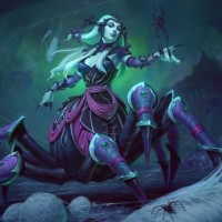 a dynamic pose, with her body forming an arch and her arms outstretched as if she's either attacking or defending from something. Her attire and the spider motif suggest that she might be a guardian, warrior, or protector associated with