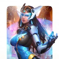 dark hair and is wearing a costume that includes metallic blue accents and what seem to be electronic components on the right arm, suggesting she might have abilities related to technology or magic in the game. The background features a vibrant, colorful energy effect, which adds to the fantastical
