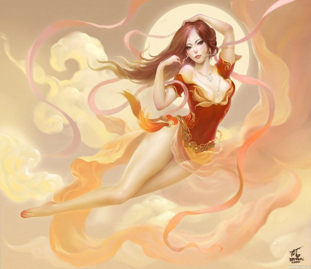 red hair and is wearing a traditional, possibly Asian-inspired outfit with flowing fabric that could represent fire or energy based on the motifs around her. The background suggests an ethereal, cloud-like environment, and there's