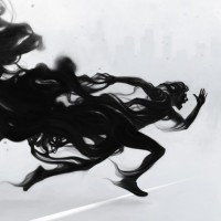 The image shows a character that appears to be female, running away from what looks like a large explosion or cloud of smoke. The smoke is black and billowing outward, creating an impression of motion and urgency. There's no clear indication of the girl's identity or the context of the scene.