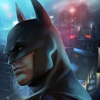 signature costume with a cowl, cape, and emblem on his chest. The background suggests a futuristic or dystopian setting with high-tech architecture that could be part of