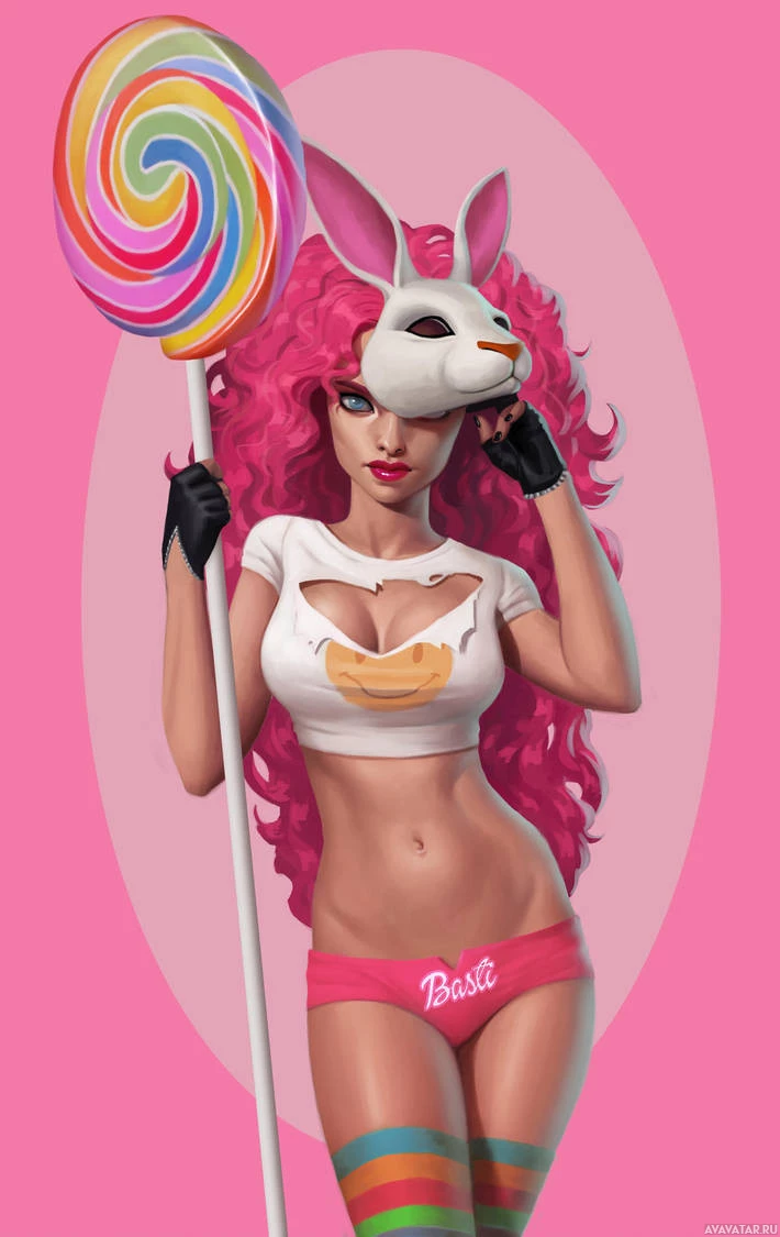 На картинке изображен анимированный персонаж, который выглядит как женщина с розовыми волосами в маске кролика на глазах. Она держит леденец, который является разновидностью кондитерской. Фон изображения имеет круговой рисунок, напоминающий конфетную трость.